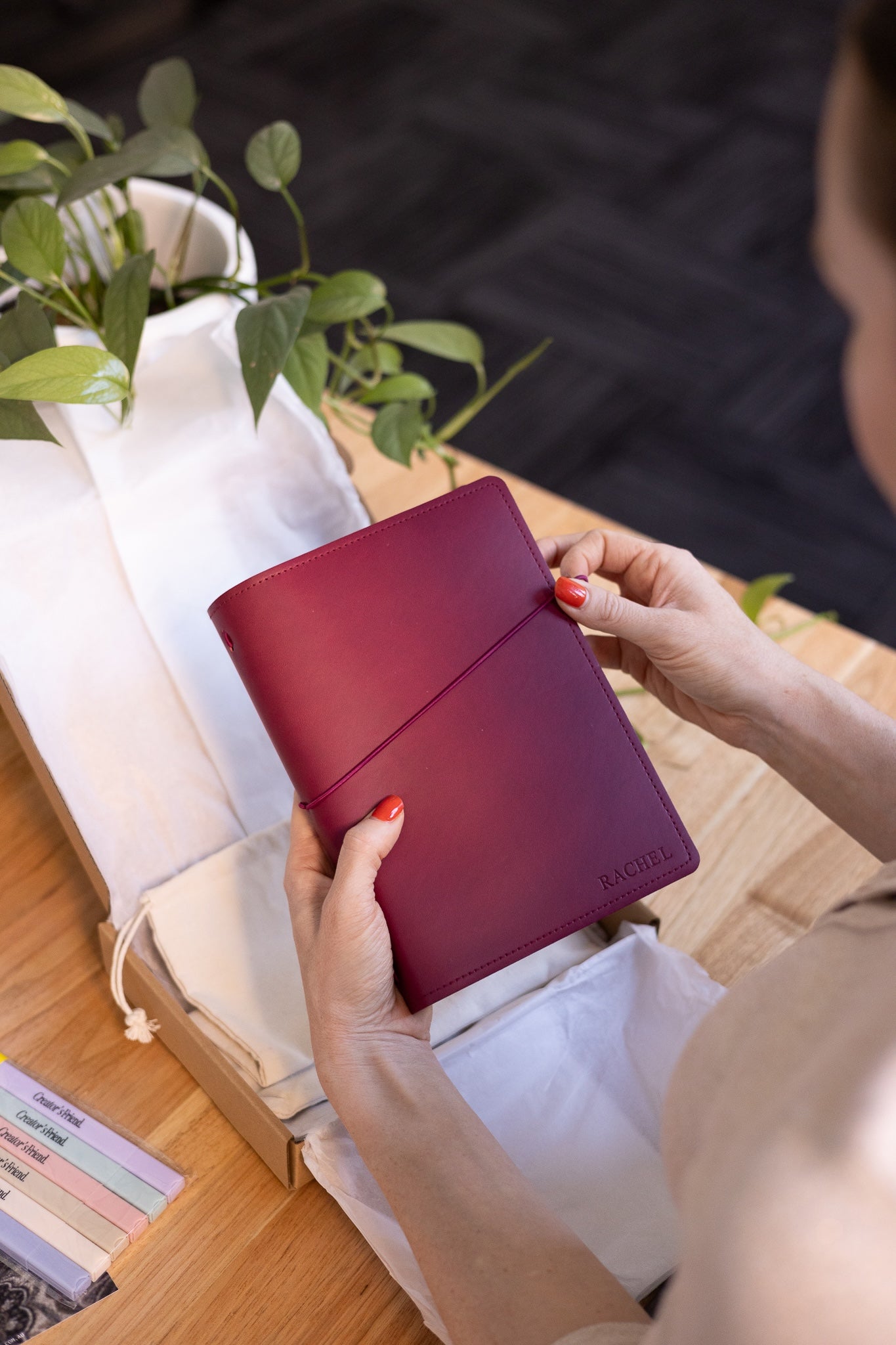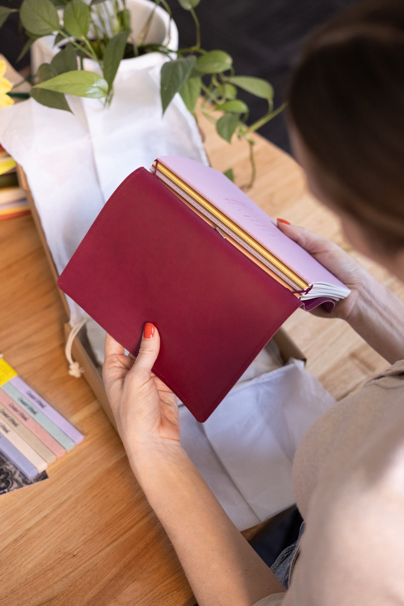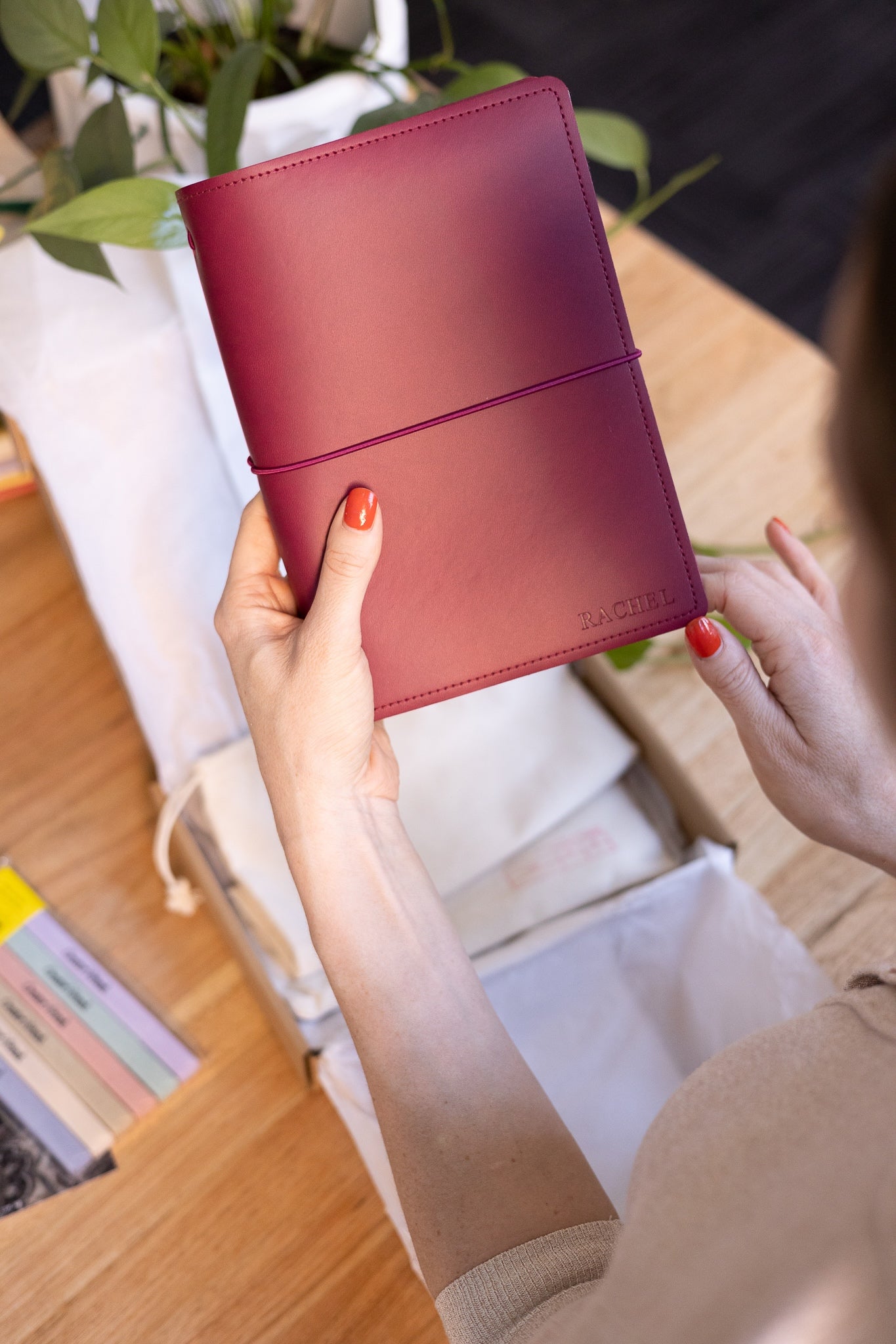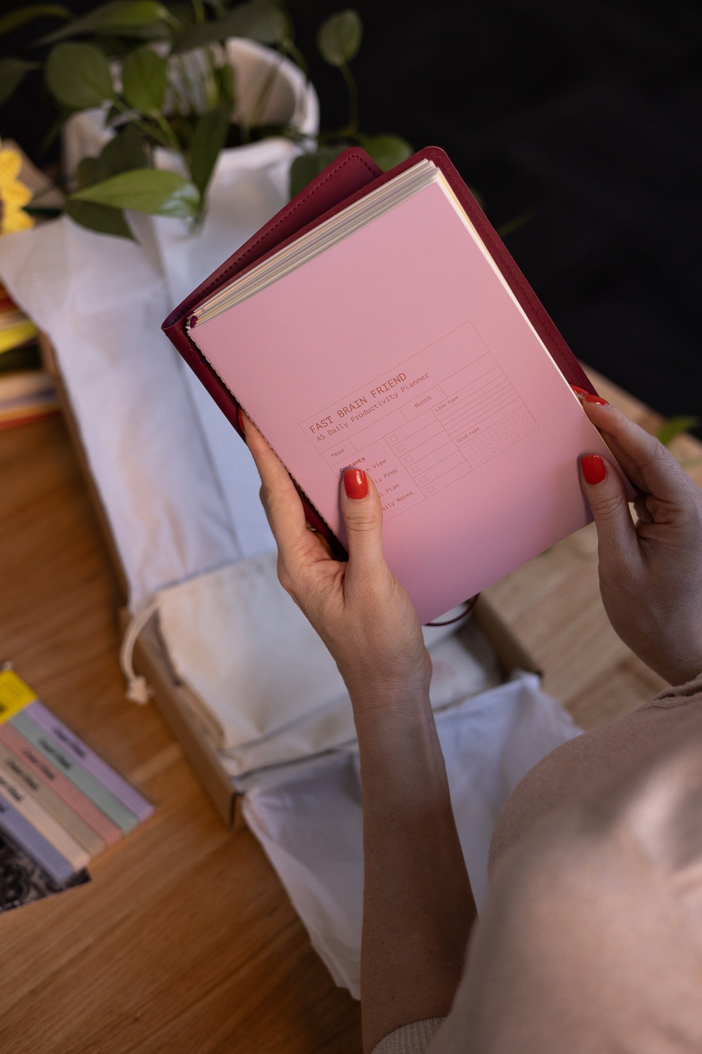 Person holding a red notebook over a white bag with a plant and books in the background