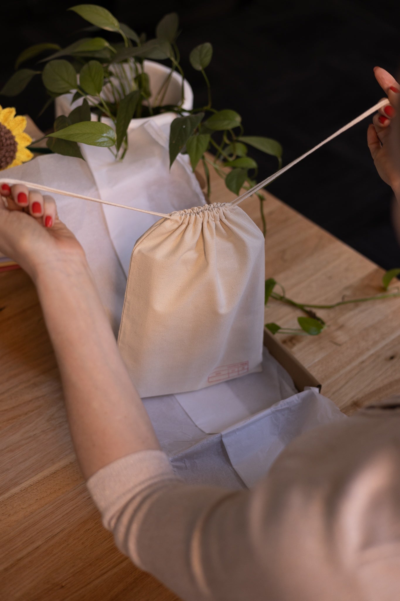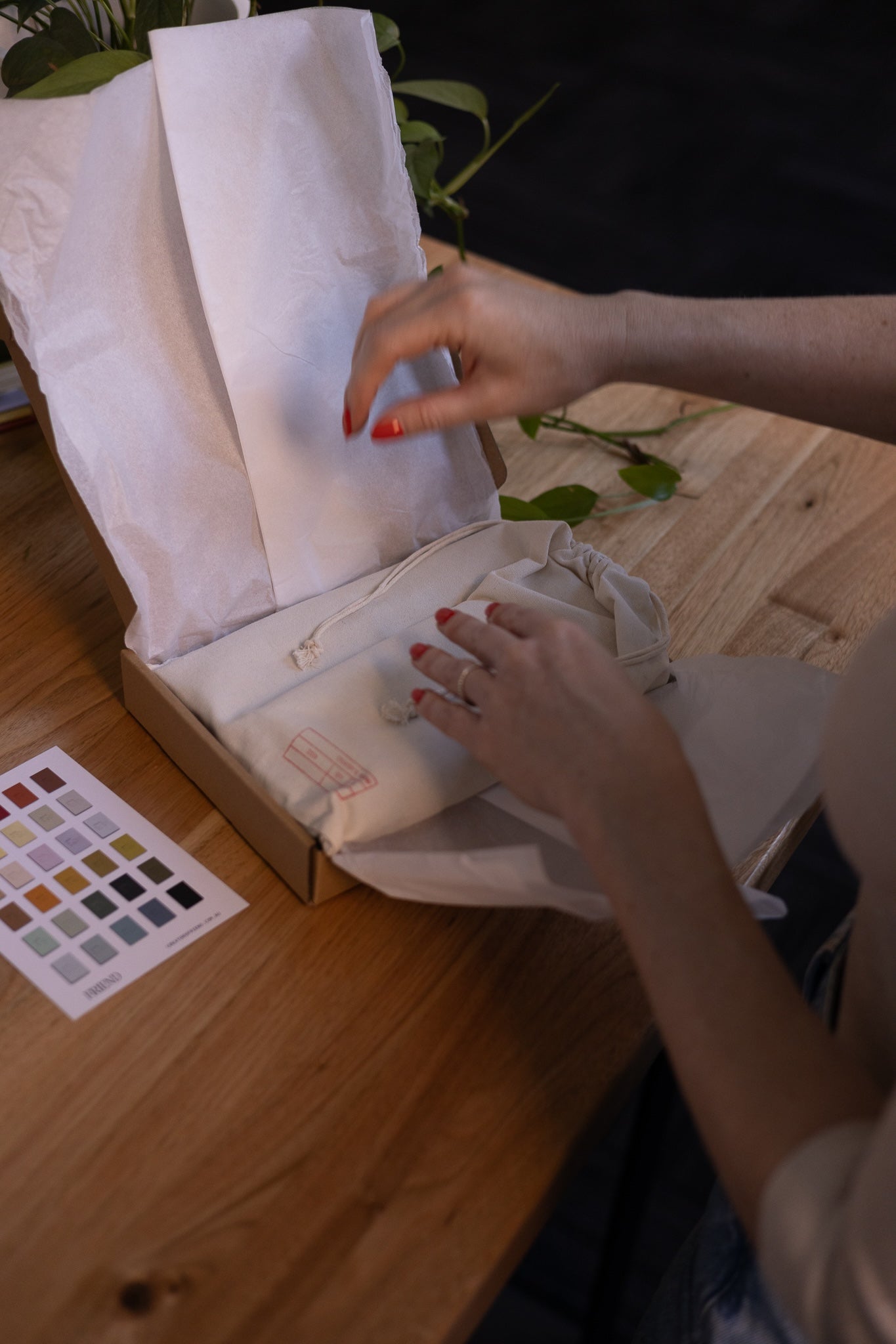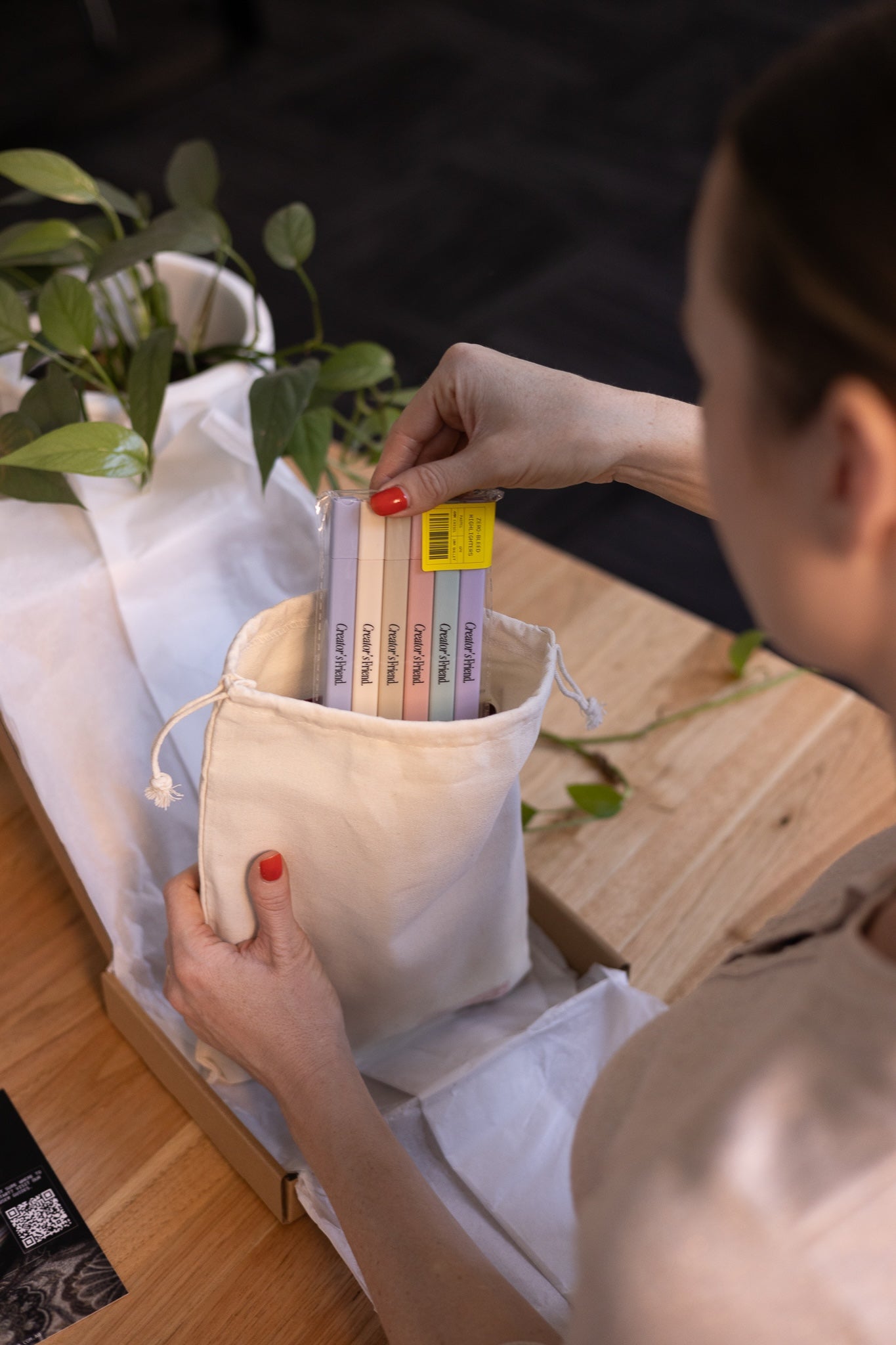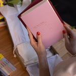 Person holding a red notebook over a white bag with a plant and books in the background
