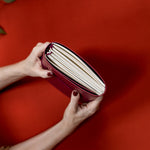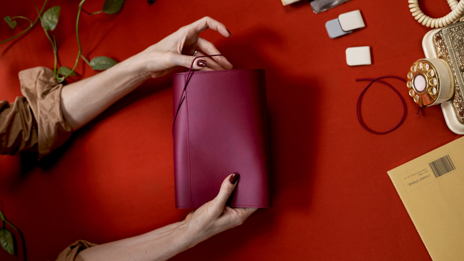 Person holding a red notebook over a white bag with a plant and books in the background