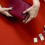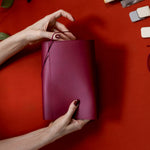 Black leather bag with a maroon NOTEBOOK FOLIO, against a blurred background.